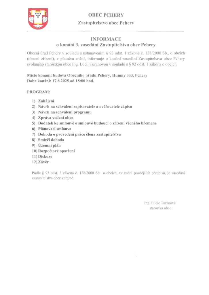 Informace o konání 3. zasedání zastupitelstva